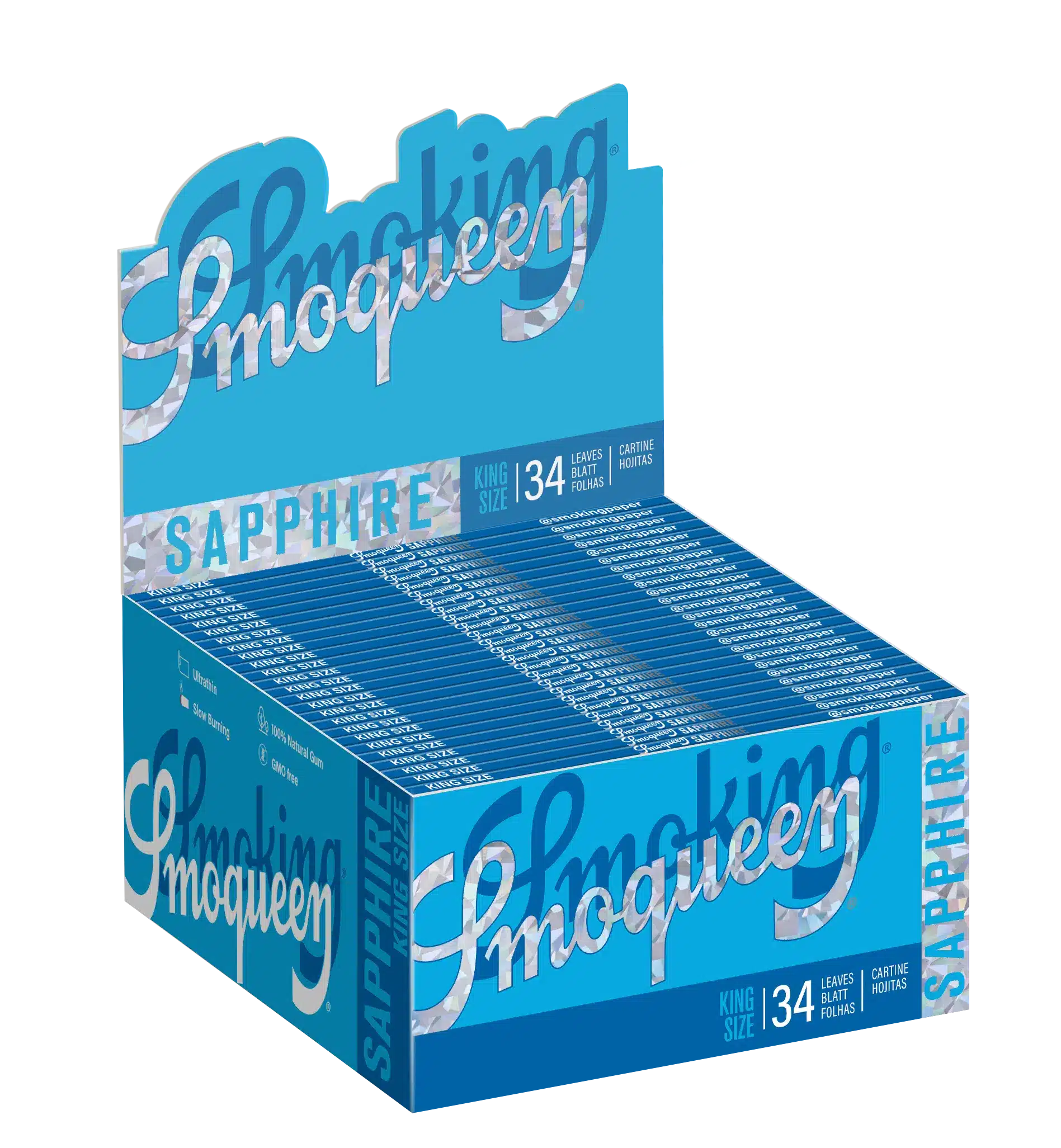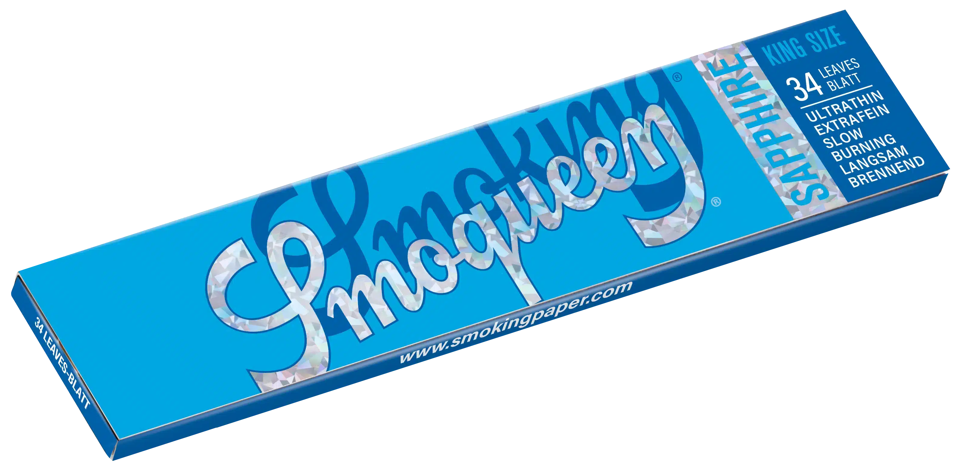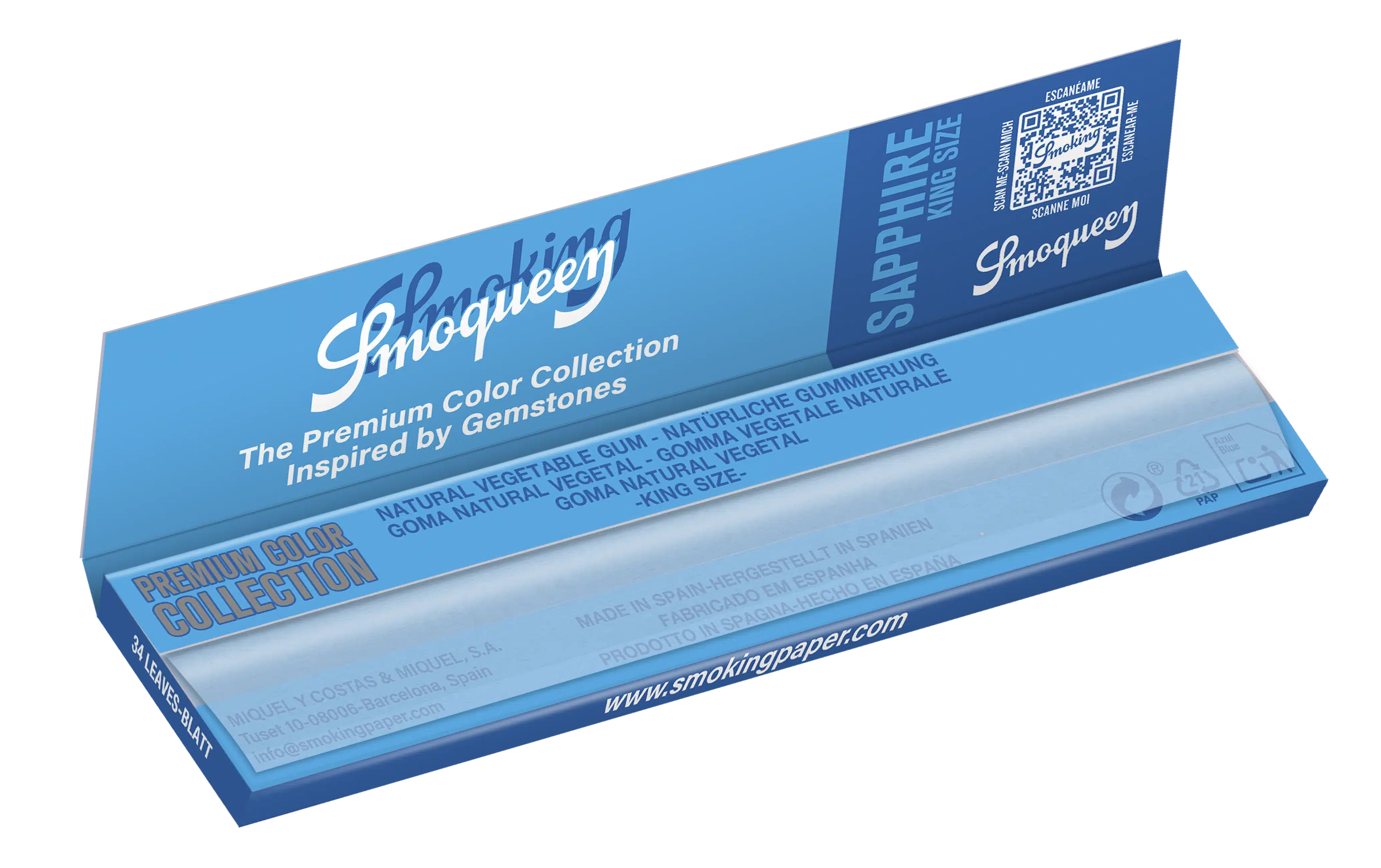 Inspirado en el brillo del zafiro, el Smoking Smoqueen Sapphire King Size pertenece a la colección premium “Gemstones”. Un librito de papel de color azul con 34 hojas, creado con colorante alimenticio que no altera el sabor del papel ni los aromas de tu mezcla. Papel ultrafino de 13 g/m² y combustión lenta para una experiencia suave y equilibrada.